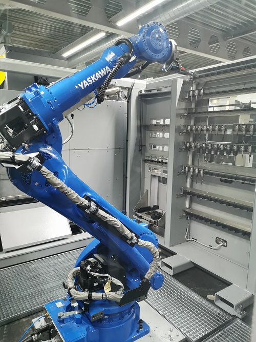 Mit dem neuen Knickarm-Roboter können zwei Fräsmaschinen bestückt werden mit unterschiedlichen Paletten, Elektrodenhaltern und zusätzlichen Werkzeugen. Der Roboter der komplexen Anlage kann Gewichte bis 250kg exakt Positionieren. Damit sollen die zwei Fräsmaschinen mehr produktive Stunden in der Nacht und an Wochenenden erreichen. Dies mannlos, also ohne Personal im Betrieb. So möchten wir ohne Schichtbetrieb unsere Anlagen noch mehr in der Nacht arbeiten lassen.